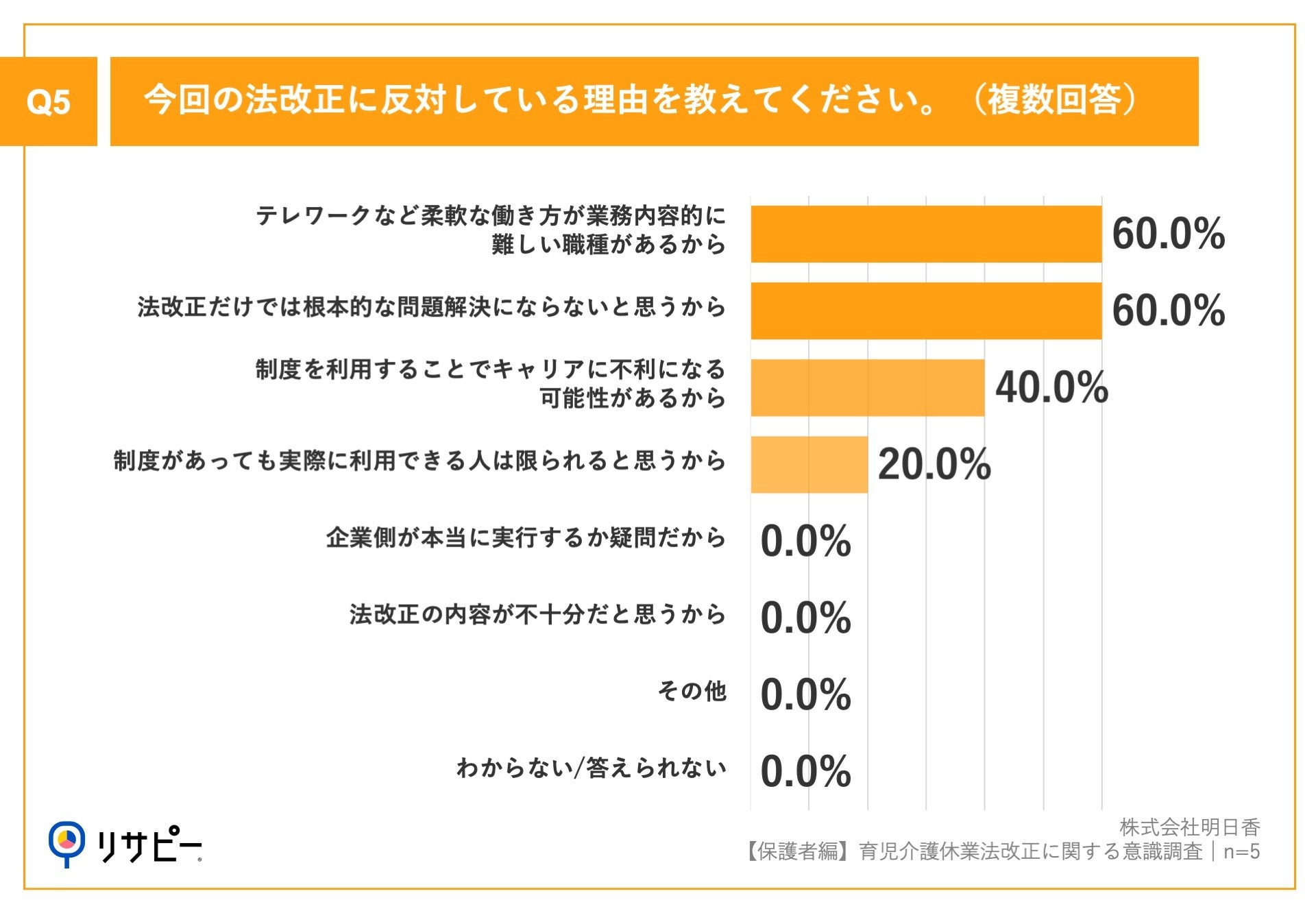 Q2で「やや反対」「反対」と回答した方に、「Q5.今回の法改正に反対している理由を教えてください。(複数回答)」(n=5)と質問したところ、「テレワークなど柔軟な働き方が業務内容的に難しい職種があるから」が60.0%、「法改正だけでは根本的な問題解決にならないと思うから」が60.0%、「制度を利用することでキャリアに不利になる可能性があるから」が40.0%という回答となりました。
