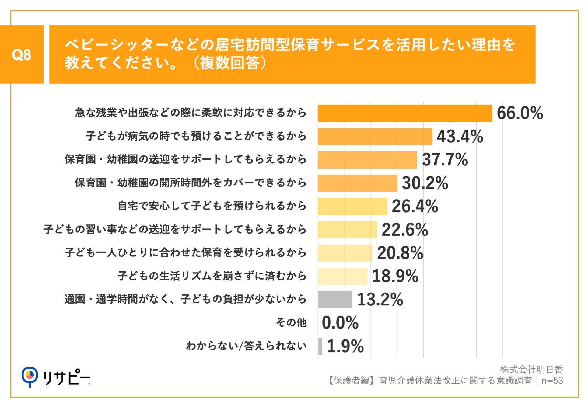 Q7で「すでに活用している」「積極的に活用したい」「機会があれば活用したい」と回答した方に、「Q8.ベビーシッターなどの居宅訪問型保育サービスを活用したい理由を教えてください。(複数回答)」(n=53)と質問したところ、「急な残業や出張などの際に柔軟に対応できるから」が66.0%、「子どもが病気の時でも預けることができるから」が43.4%、「保育園・幼稚園の送迎をサポートしてもらえるから」が37.7%という回答となりました。