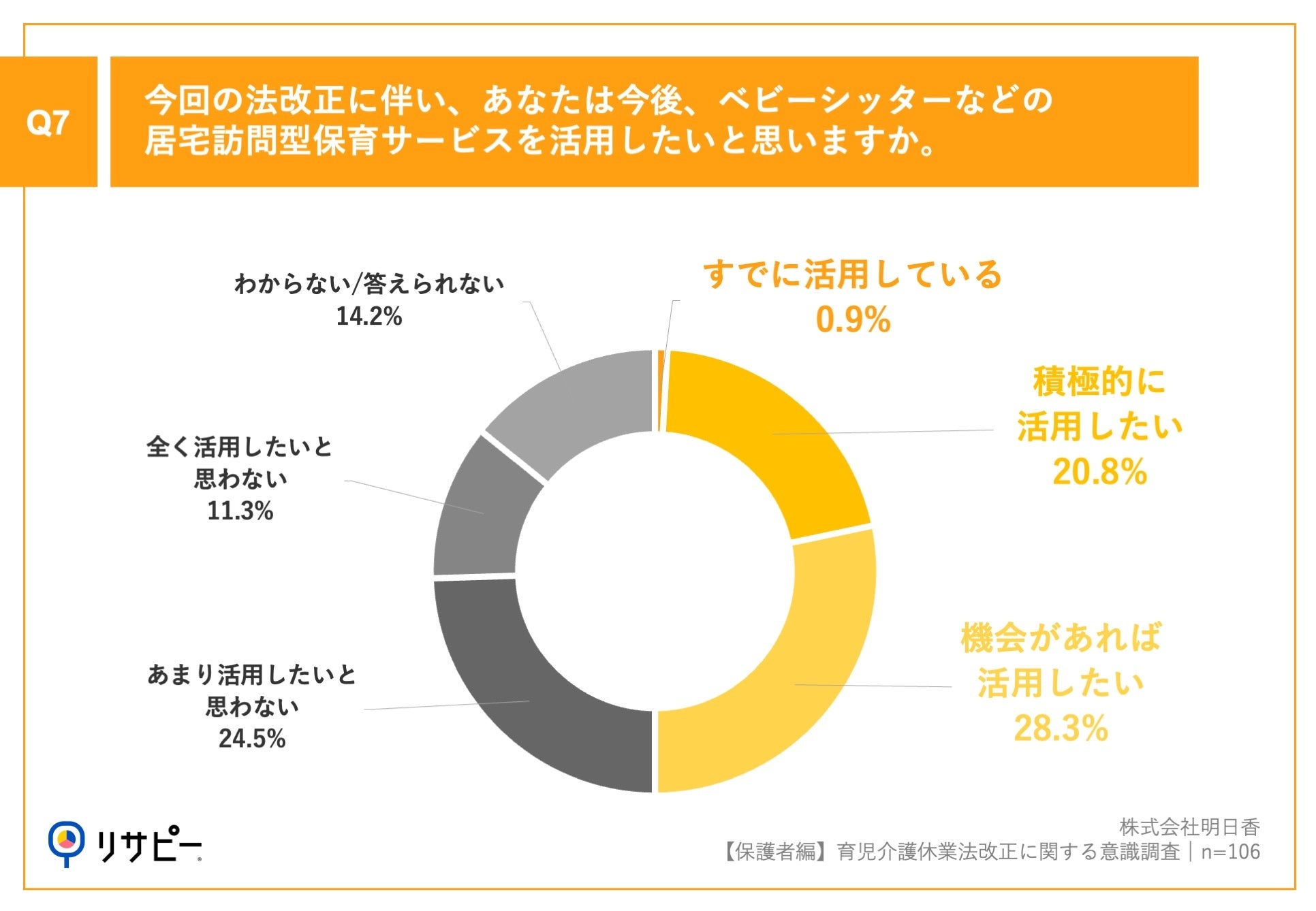 「Q7.今回の法改正に伴い、あなたは今後、ベビーシッターなどの居宅訪問型保育サービスを活用したいと思いますか。」(n=106)と質問したところ、「すでに活用している」が0.9%、「積極的に活用したい」が20.8%、「機会があれば活用したい」が28.3%という回答となりました。
