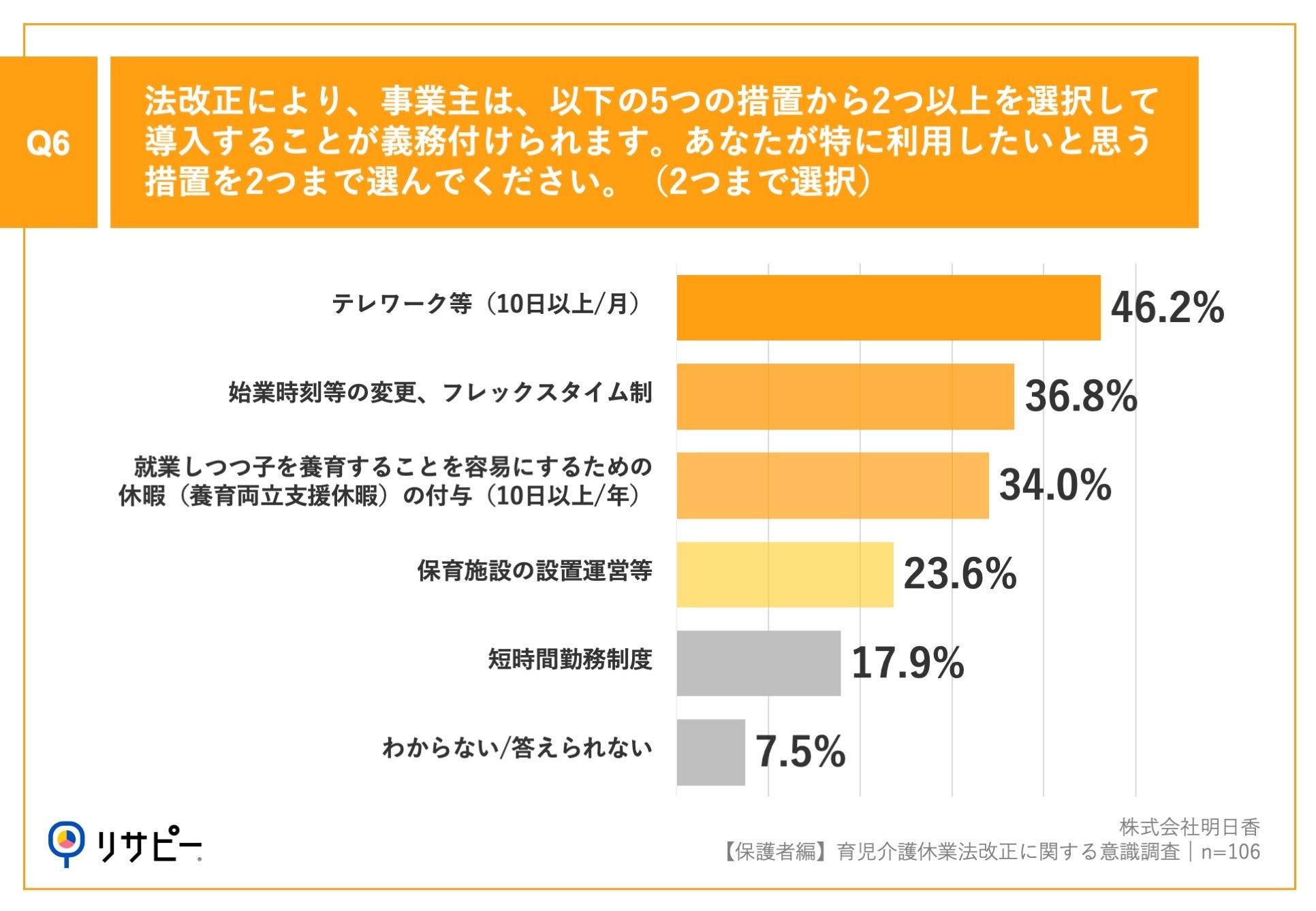 「Q6.法改正により、事業主は3歳~小学校入学前の子を養育する労働者向けに、以下の5つの措置から2つ以上を選択して導入することが義務付けられます。あなたが特に利用したいと思う措置を2つまで選んでください。(2つまで選択)」(n=106)と質問したところ、「テレワーク等(10日以上/月)」が46.2%、「始業時刻等の変更、フレックスタイム制」が36.8%、「就業しつつ子を養育することを容易にするための休暇(養育両立支援休暇)の付与(10日以上/年)」が34.0%という回答となりました。
