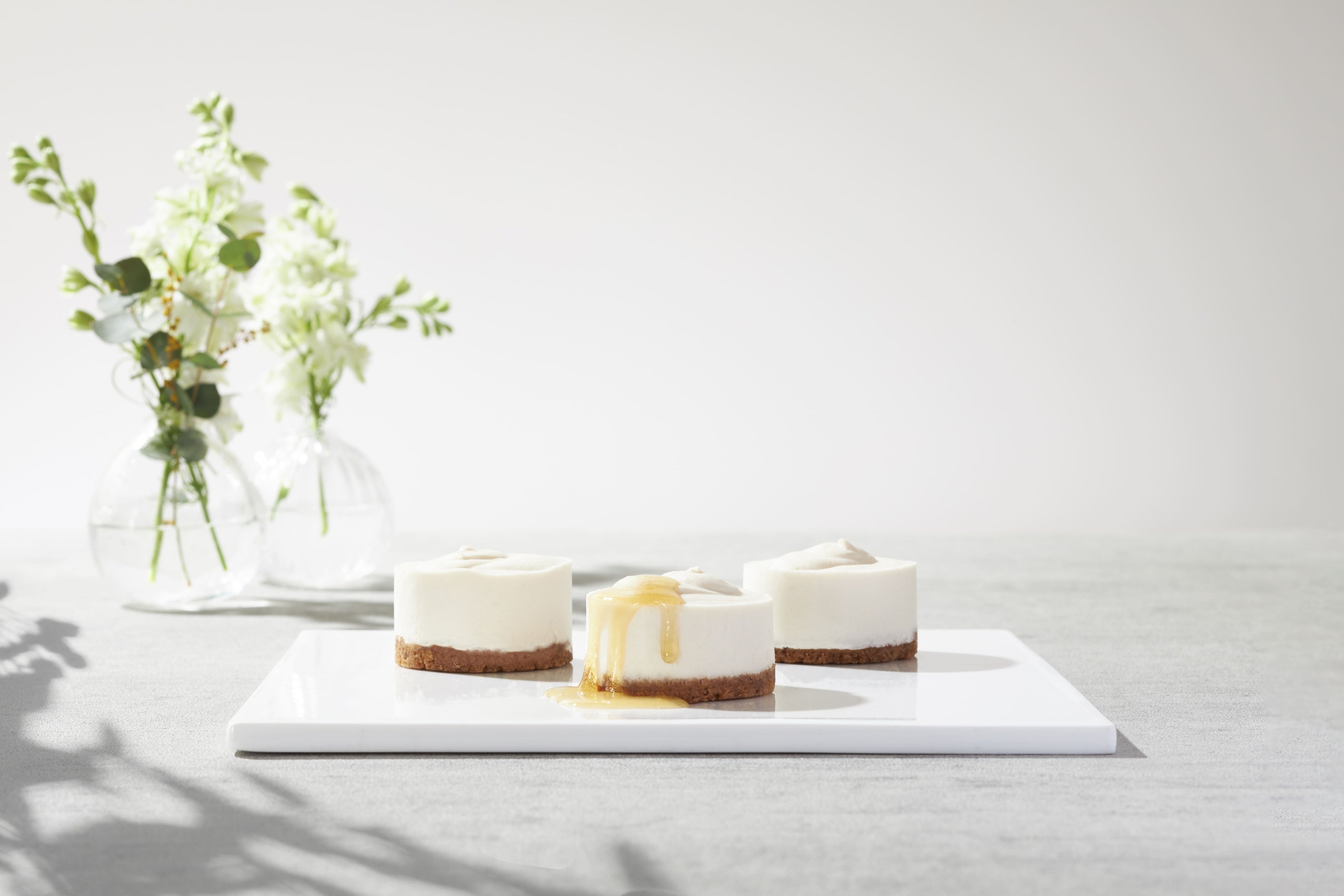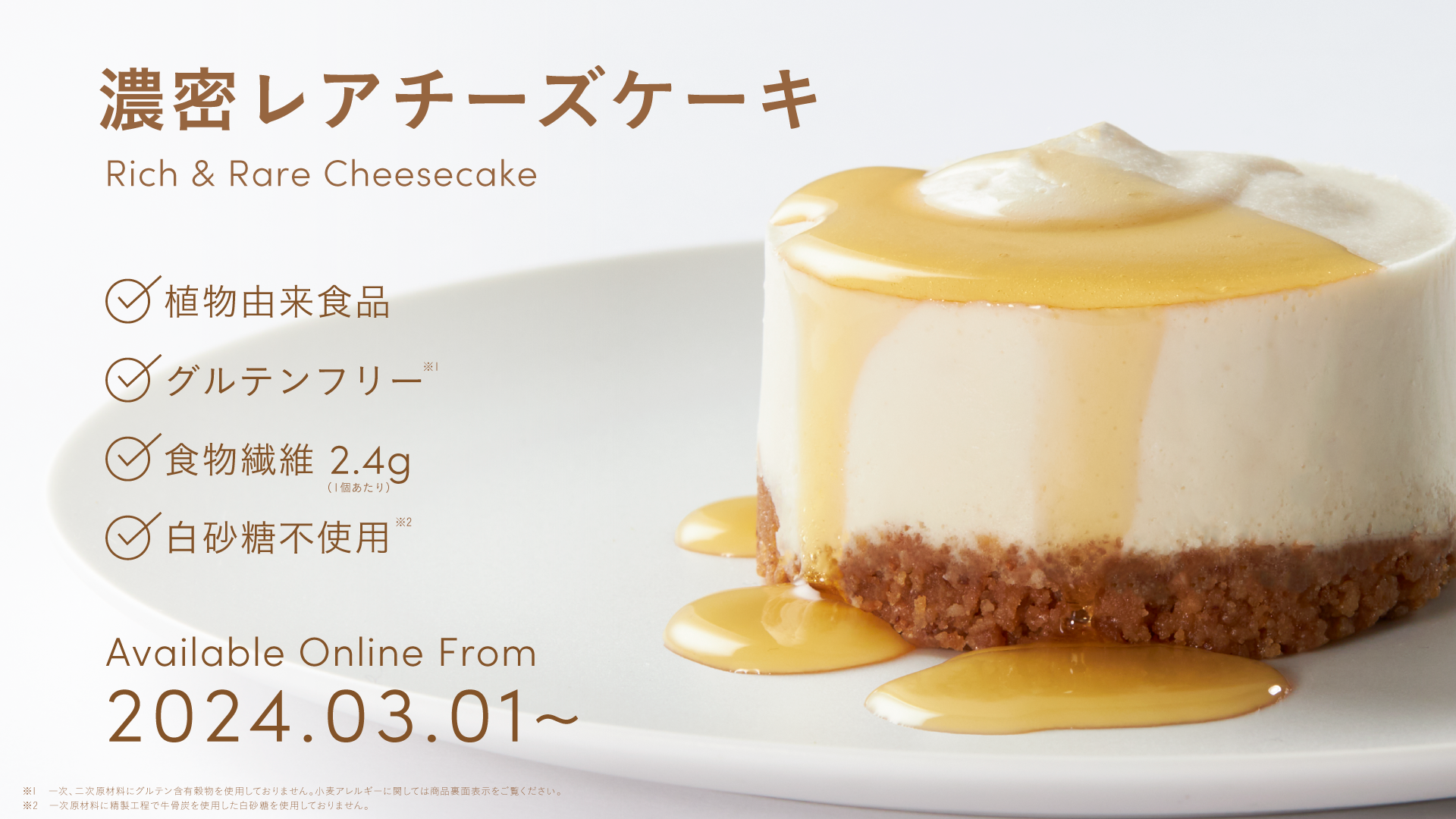 このレアチーズムースとクッキーボトムの2層仕立てで作り上げた「濃密レアチーズケーキ」は、植物由来でできていることから、重厚感や満足感のある食べ応えにも関わらず、後味は軽やかにお召し上がりいただけます。