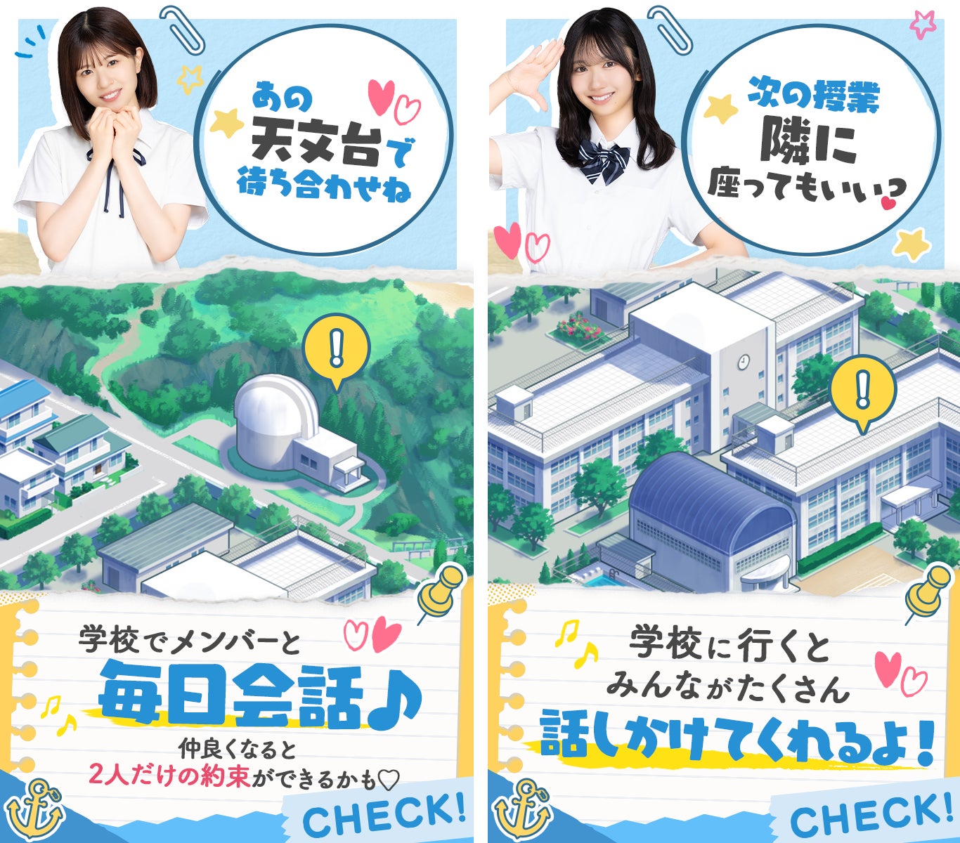学園へ向かうと日向坂46メンバーが話しかけてくれる「学園会話機能」が新登場。場所に応じた会話やその日のテンションによって会話内容が多岐に渡ります。