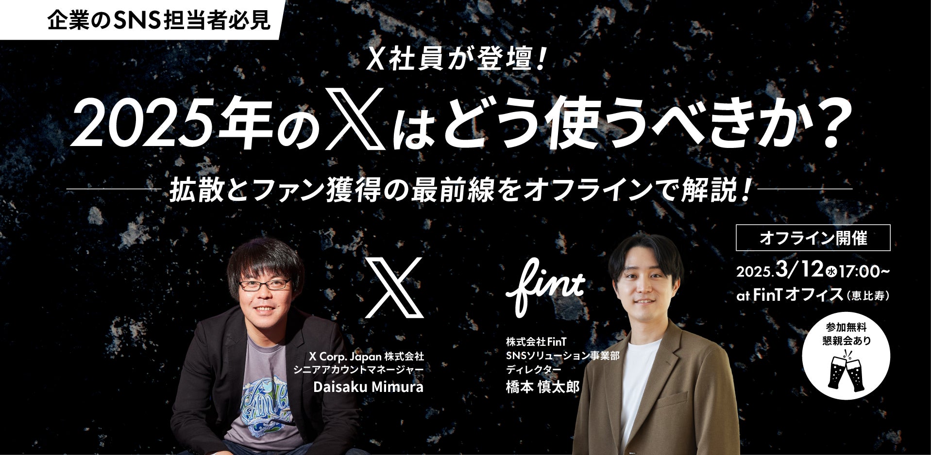 株式会社FinT(本社:東京都渋谷区、代表取締役:大槻祐依)は、X Corp. Japan株式会社(本社:東京都中央区、代表取締役社長:松山歩)と共同で、「2025年のXはどう使うべきか?拡散とファン獲得の最前線」をテーマに、オフラインイベントを、2025年3月12日(水)17:00-19:00に開催します。