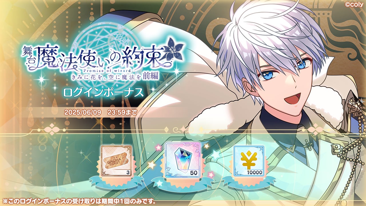 <舞台『魔法使いの約束』きみに花を、空に魔法を 前編 上演記念ログインボーナス>マナ石(無償) 50 個、ガチャチケット 3 枚、エン 10,000