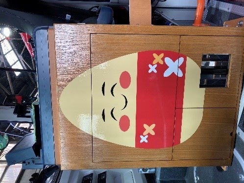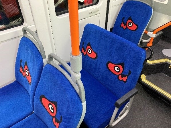 新たな「あかべぇ」の車両は外装の大きなマスコットキャラクターあかべぇが目を惹くデザインですが、座席シート等にもあかべぇデザインが施され、乗車した後も乗客の皆様に観光のワクワク感をお楽しみいただける車両といたしました。