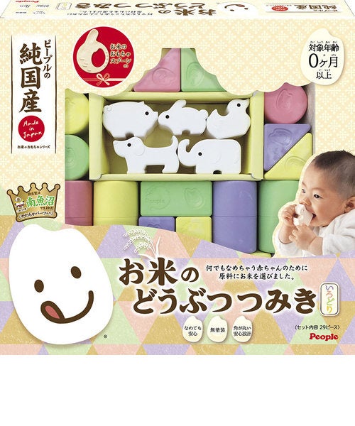 365日の発達と共に遊び方が変わる赤ちゃんたちの「遊びやすさ」を追求して作った、お誕生~3歳頃まで長く遊べる原料にお米を使ったつみきです。
