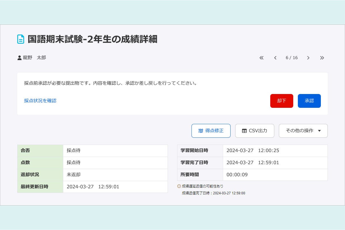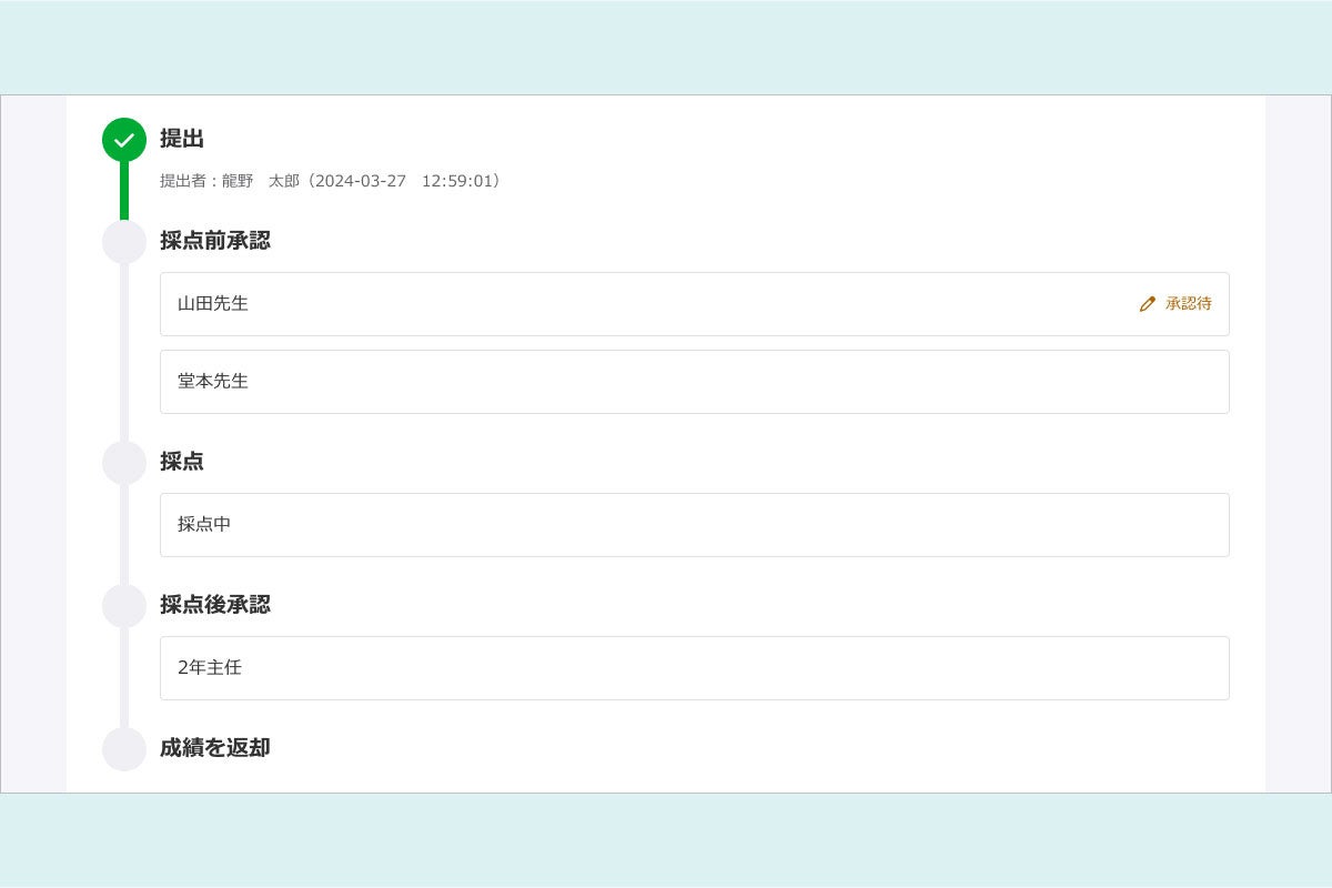 提出物の採点について、システム上で担当者の割り当てや、フローの進行状況が確認できる機能です。