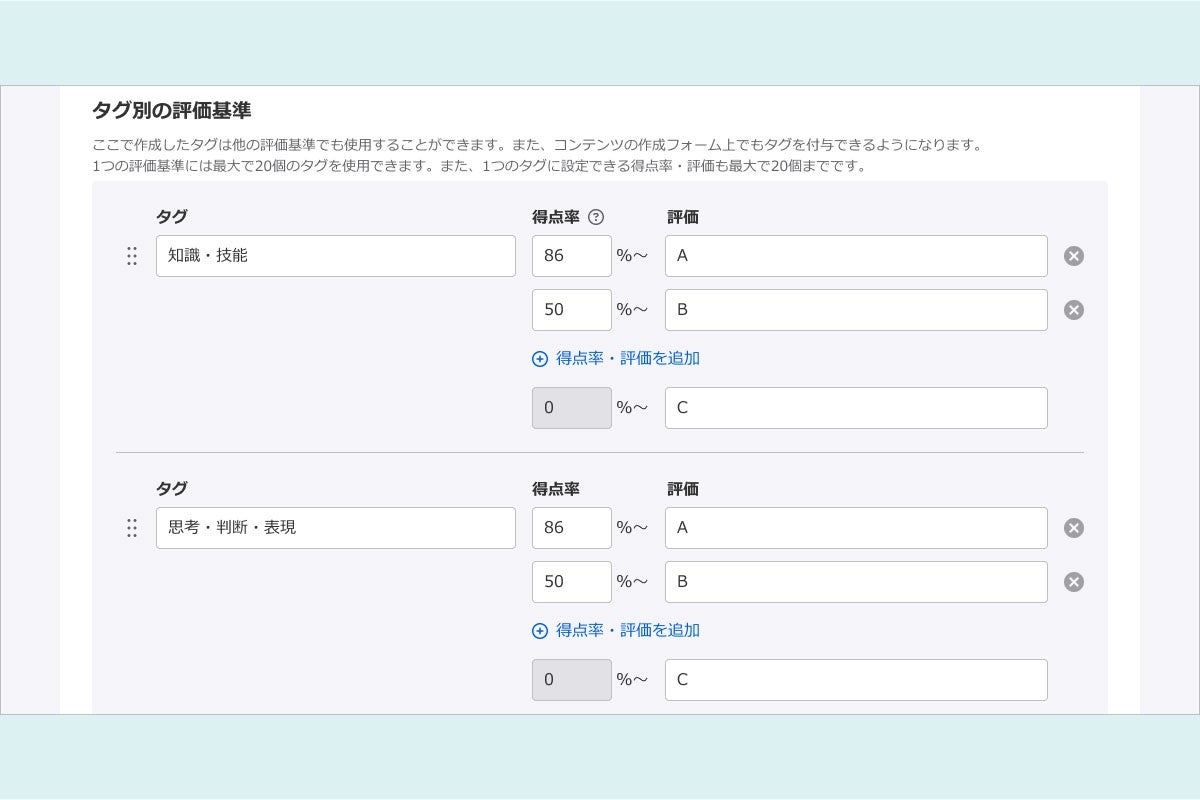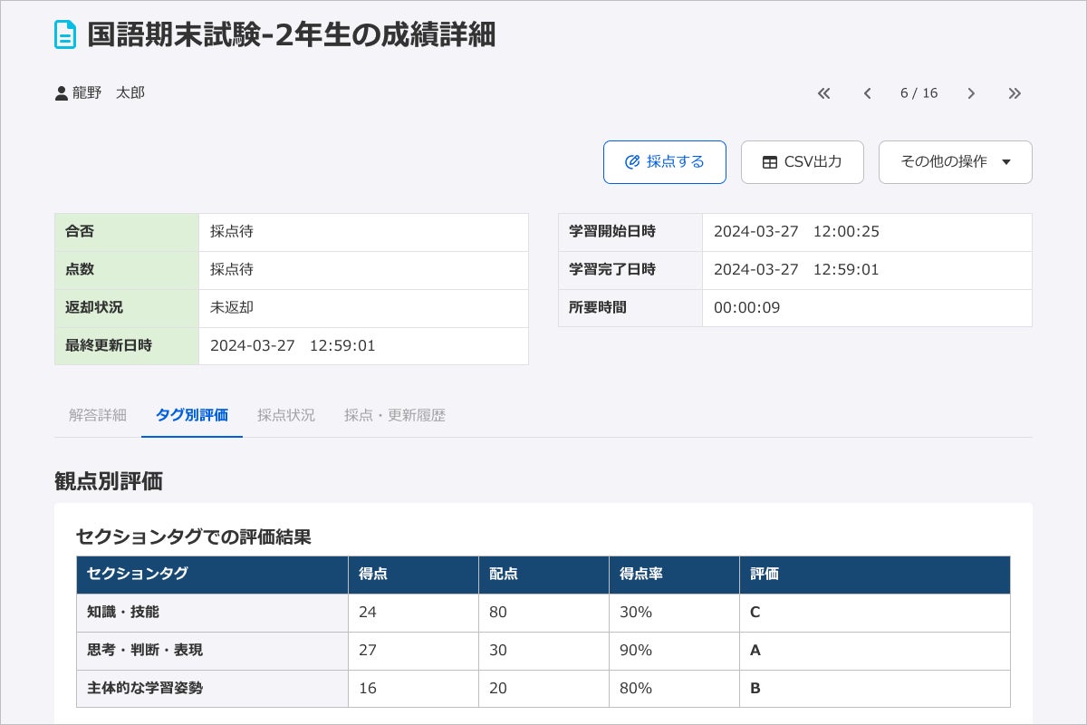 2022年度からの学習指導要領改訂に伴う3観点(「知能・技能」「思考・判断・表現」「主体的に学習に取り組む態度」)での評価を、システム上で実現するための機能です。