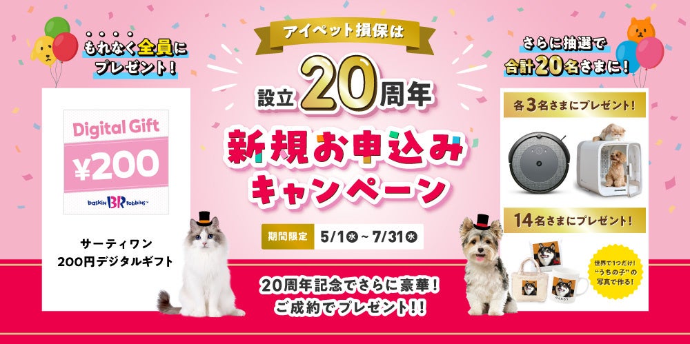 本キャンペーンは、期間中にペット保険にお申込みいただいたご成約者さま全員に、「サーティワン 200円デジタルギフト」をプレゼントします。また、抽選で各3名さまに人気のロボット掃除機やペットドライルームが当たるほか、抽選で14名さまに20周年限定の“うちの子”グッズ3点セットが当たります。