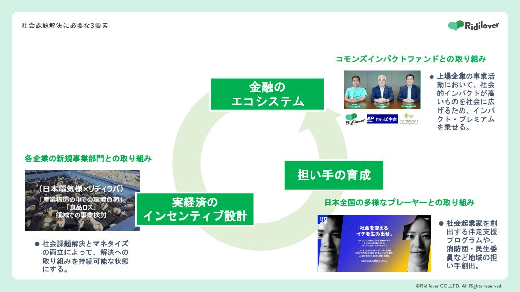 リディラバは、社会課題の解決を目指して、 「担い手の育成」「実経済のインセンティブ設計」「金融のエコシステム」の3軸から取組を進めてきました。