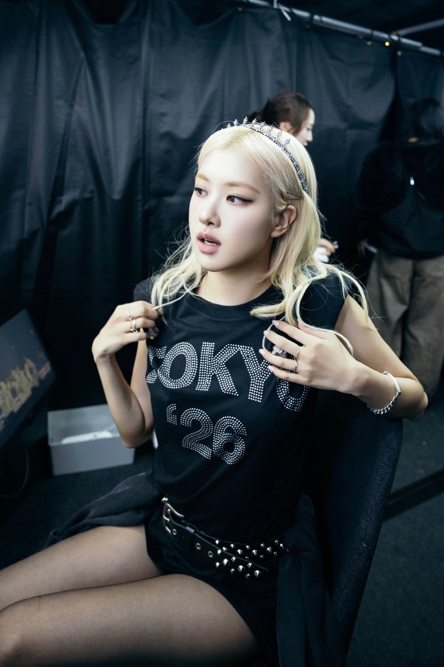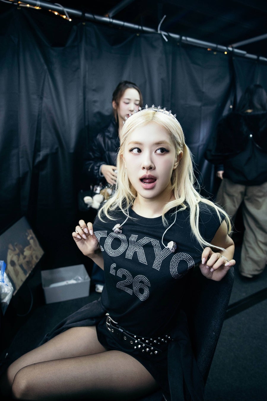 1月16日の初日公演のソロステージでは、Roséは胸元に“Tokyo 26”とマイクロスタッズであしらわれたカスタムTシャツドレスを身にまとい、彼女自身のスタイルを表現しながら、アーティストとブランド双方の反骨的なスピリットを体現しました。彼女はそのルックを、スタッズのディテールが施されたガーメントウォッシュのフーディーと、特注のレザージャケットと手作業でスタッズを打ち込んだベルトを合わせて仕上げました。アンコールステージでは、ブルーデニムにスタッズをあしらったミニスカート姿で登場し、スタッズをディテールにあしらったフーディーを着用しました。