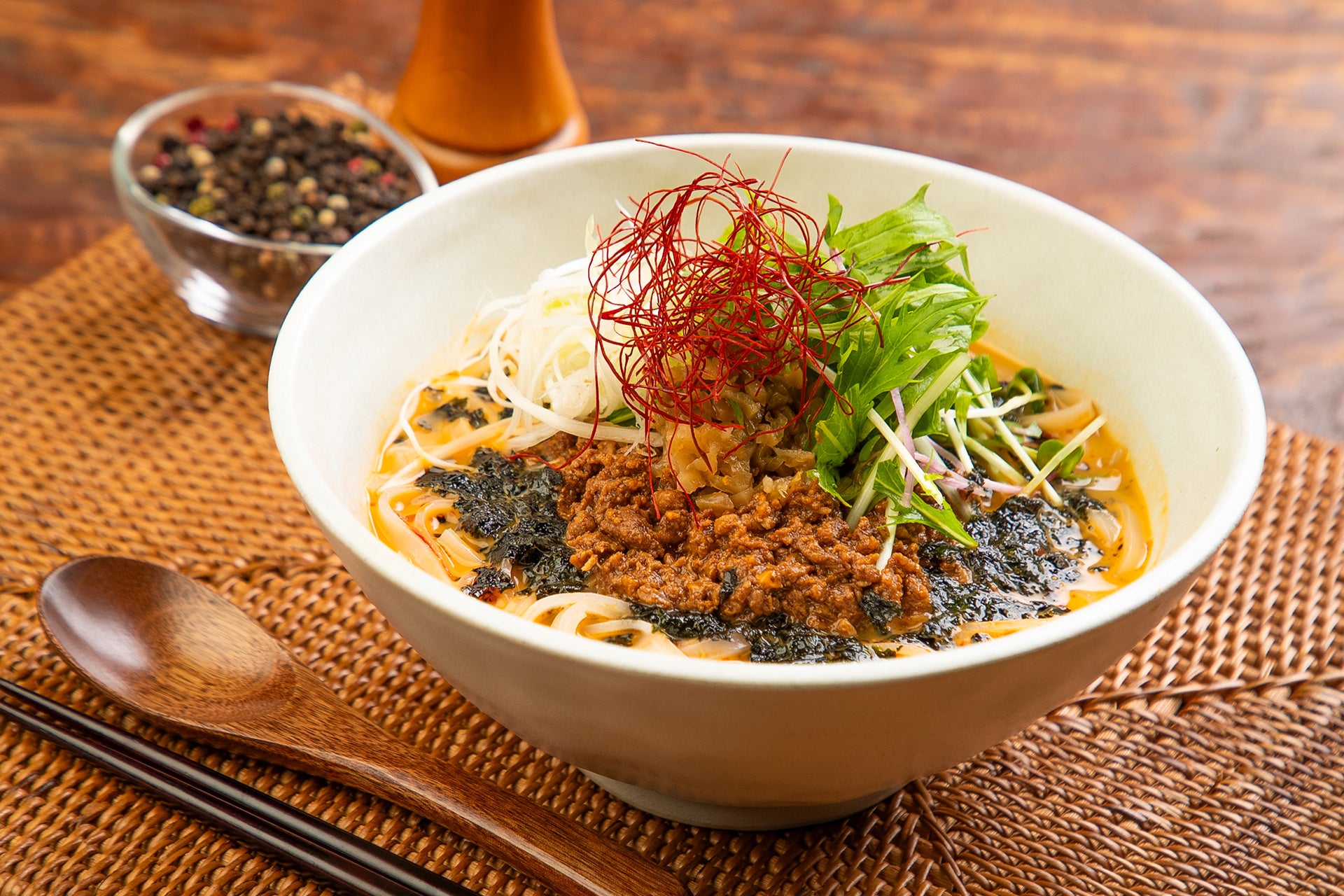 一方、夏季限定の「夏野菜の冷製坦々米麺」は、暑い季節にぴったりの一品です。冷たく滑らかな米麺に、ピリッとした辛さを持つ坦々ソースを合わせ、トマト、コーン、赤玉ねぎ、ザーサイ、そしてパクチーをトッピング。これらの食材が組み合わさり、夏に求める涼やかな風味と食感を提供します。