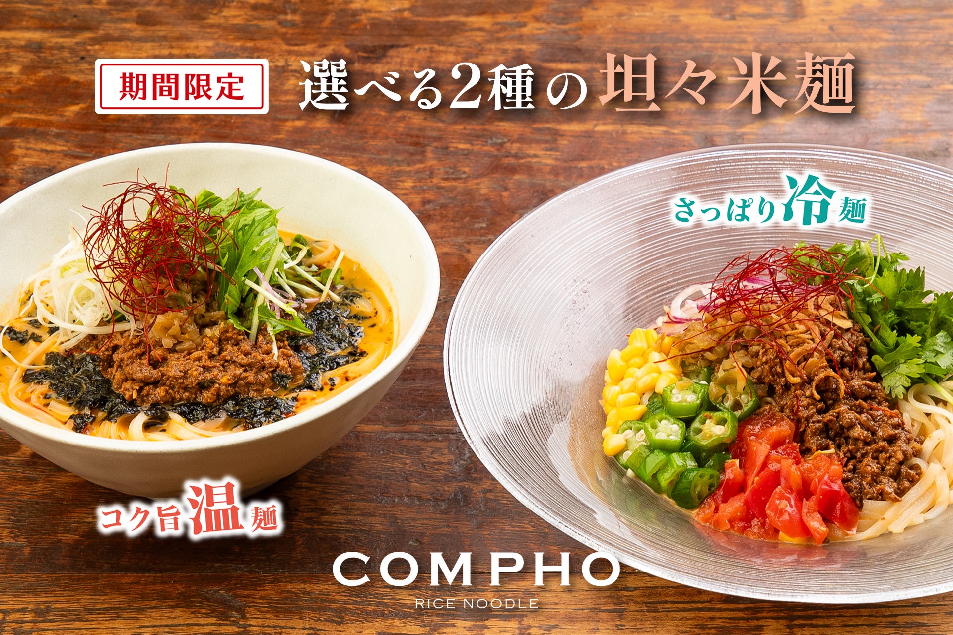 【COMPHO】新メニュー登場「もみ海苔の黒坦々米麺」と「夏野菜の冷製坦々米麺」7月12日(金)より提供開始