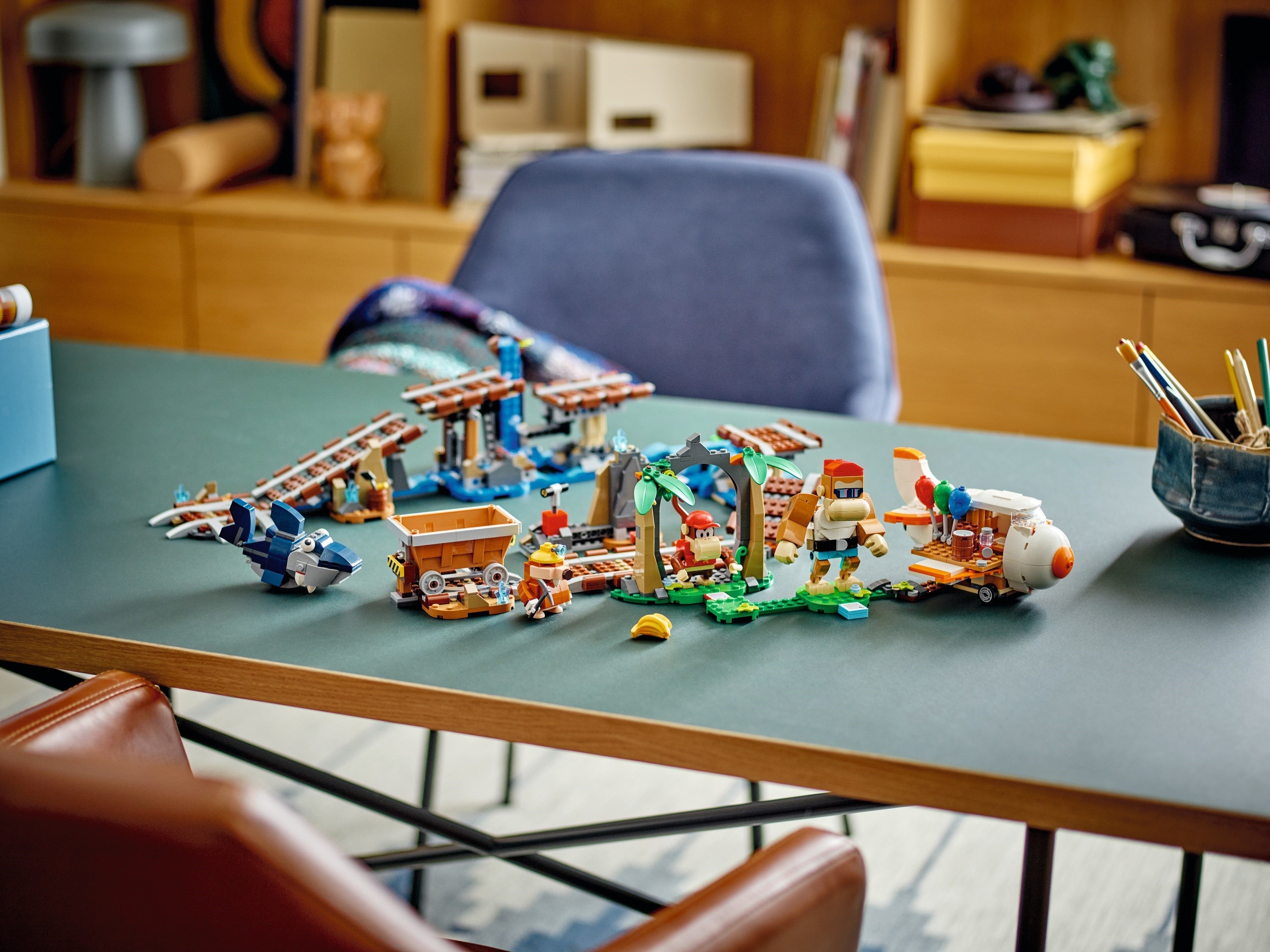 ドンキーコングならではのトロッコアクションに挑戦できる、1,157ピースで構成されたセットです。「レゴ®スーパーマリオ™」のフィギュアをトロッコに乗せると、レールの上を走り回ることができます。水辺で待ち構えるラングィを跳ねのけたり、壊れたレールを修理したり、敵のモグリャ-を倒したり、はたまた岩を爆発させて、隠されたバナナを手に入れたりと、さまざまなチャレンジに挑戦できます。さらにファンキーコングのお店で風船を手に入れたり、飛行機にフィギュアを乗せて飛ばして遊んだりといった遊びも楽しめます。