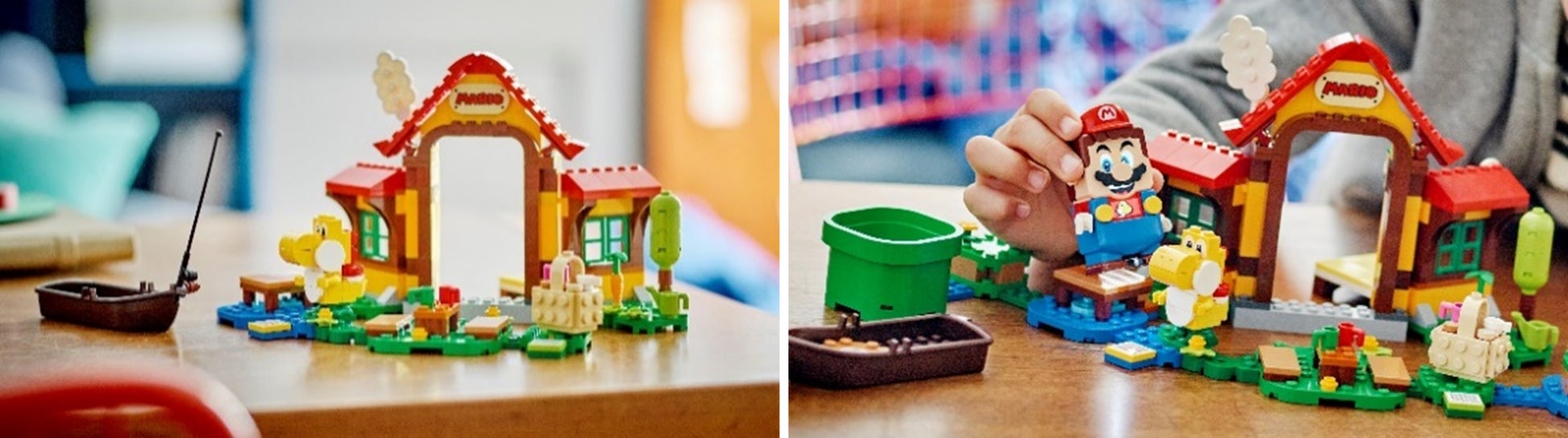 お庭付きのマリオハウスを組み立てられる拡張セットです。お庭の野菜に水をやったり、ホッケーをして遊んだり、さらに船に乗って魚釣りも!たくさん遊んだら、バスケットに入ったおやつを食べて、おうちのベッドでお昼寝するもの良いですね。