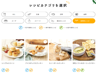 レシピページでは、乳不使用や植物性素材のみでできるメニューなど、バラエティーに富んだオリジナルレシピをご紹介しております。お料理のカテゴリーに加えて「植物性レシピ」を絞り込みタブに設置し、また3大アレルゲンの「乳」「卵」「小麦」不使用のレシピにはそれぞれのアイコンを表示することで、食物アレルギーをお持ちの方にもレシピ検索がしやすいように工夫いたしました。