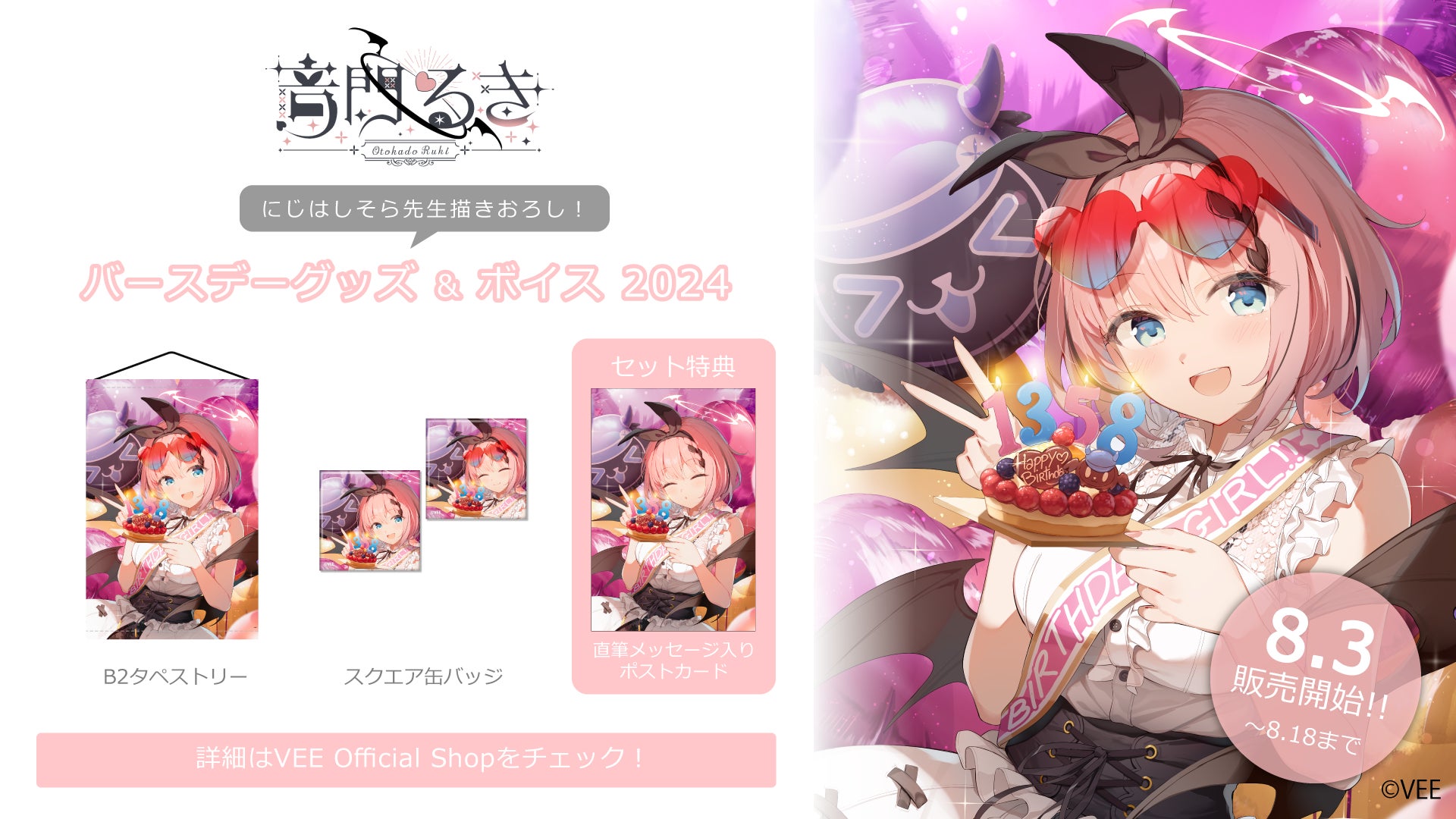 本日・8月3日に誕生日を迎えた音門るきのバースデーグッズの詳細を公開するとともに、公式オンラインショップ「VEE Official Shop」にて受注販売を開始しました。