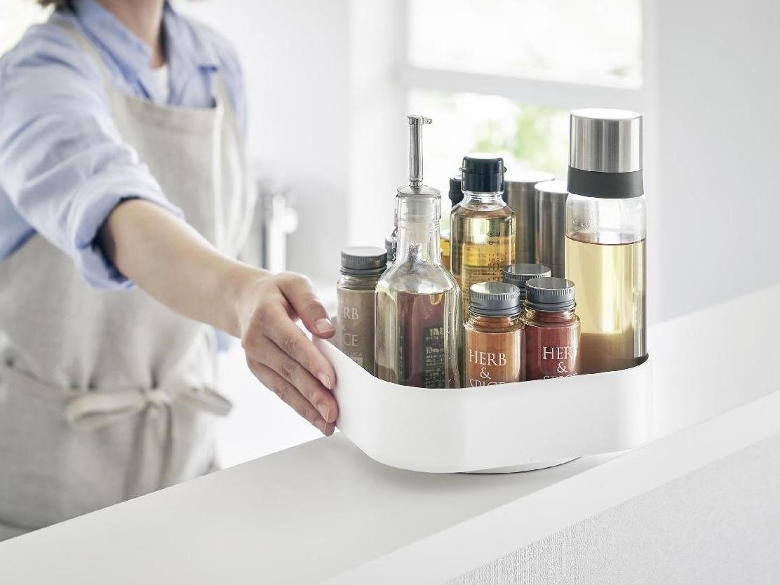 360°回転して取り出しやすく、縁に高さがあるので倒れにくい。