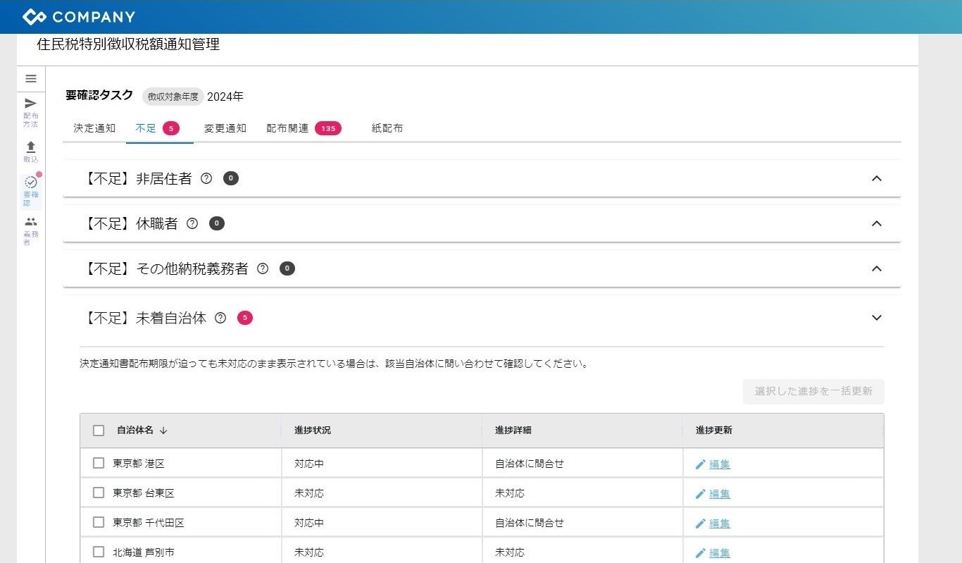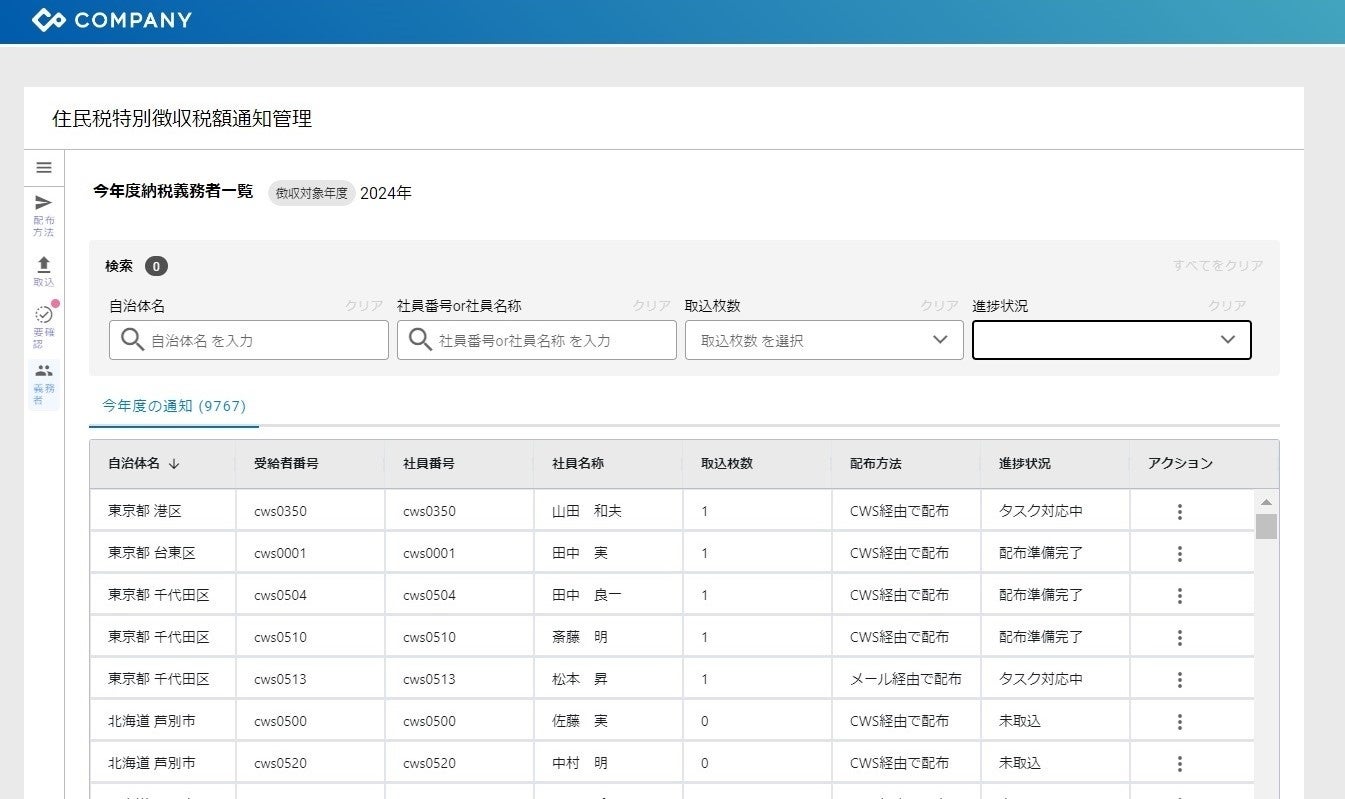 各市区町村からeLTAXを通じて事業主に届く税額通知のデータを「COMPANY」内に取り込み、市区町村ごとの受領状況等を管理することが可能です。