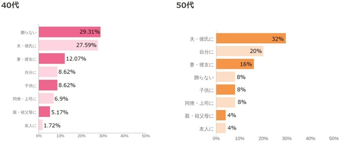 年代別に見ると20代30代の世代では夫・彼氏が45%前後を占めているい一方、自分へとの回答は1割にも達していません。40代50代では夫・彼氏に贈るというひとは30%前後で若い世代と10%以上もの開きが出ました。