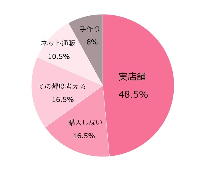 今やネット通販でなんでも手に入る便利な時代ですが、ネットで買う派は1割程度にすぎませんでした。対する実店舗派は48.5%。大手百貨店やデパートではバレンタイン期間に催事ブースで様々なチョコレートを販売したり、 有名ブランド店が一同に会するイベントなどが開催されているため、そのような場で購入しようという方が多いのだと考えられます。