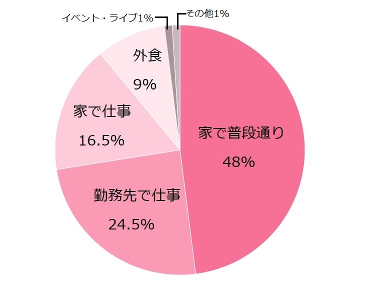 バレンタインといっても、家で普段通りだったり仕事だったりと、いつもと変わらない時間を過ごす方が多いようで、旅行やテーマパークといった回答は見られませんでした。
