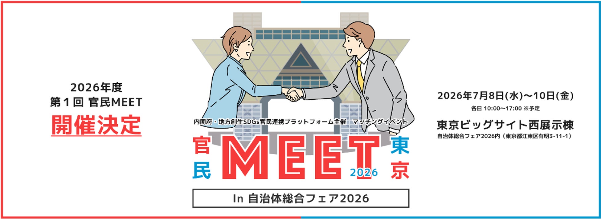 株式会社さとゆめ(本社:東京都千代田区、代表取締役:嶋田俊平)と株式会社エイチ・アイ・エス(本社:東京都新宿区、代表取締役社長:澤田秀太)が運営事務局を務める内閣府 地方創生SDGs官民連携プラットフォームは、2026年7月8日(水)〜10日(金)に東京ビッグサイトにて開催される「自治体総合フェア2026(第30回)」内にて、官民マッチングイベント「官民MEET東京」を開催します。つきましては、同イベントの自治体向け参加区画への参加団体を募集します。