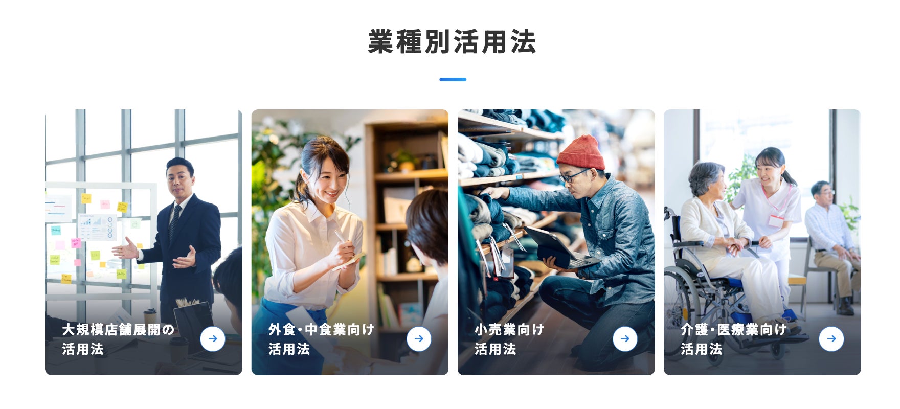 外食・中食、小売、介護・医療業といった業種ごとに専用ページを整理。また、「100店舗未満」「100店舗以上」など規模別にも導線を設け、大規模店舗展開の活用ページも新設。自社と近い環境での活用事例や機能活用方法をすぐに確認できるようになりました。