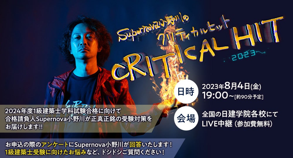 【1級建築士 学科】8月4日(金)19:00~無料開催!2023年度試験の考察&2024年度の受験対策「Supernova小野川のCRITICAL HIT 2023」