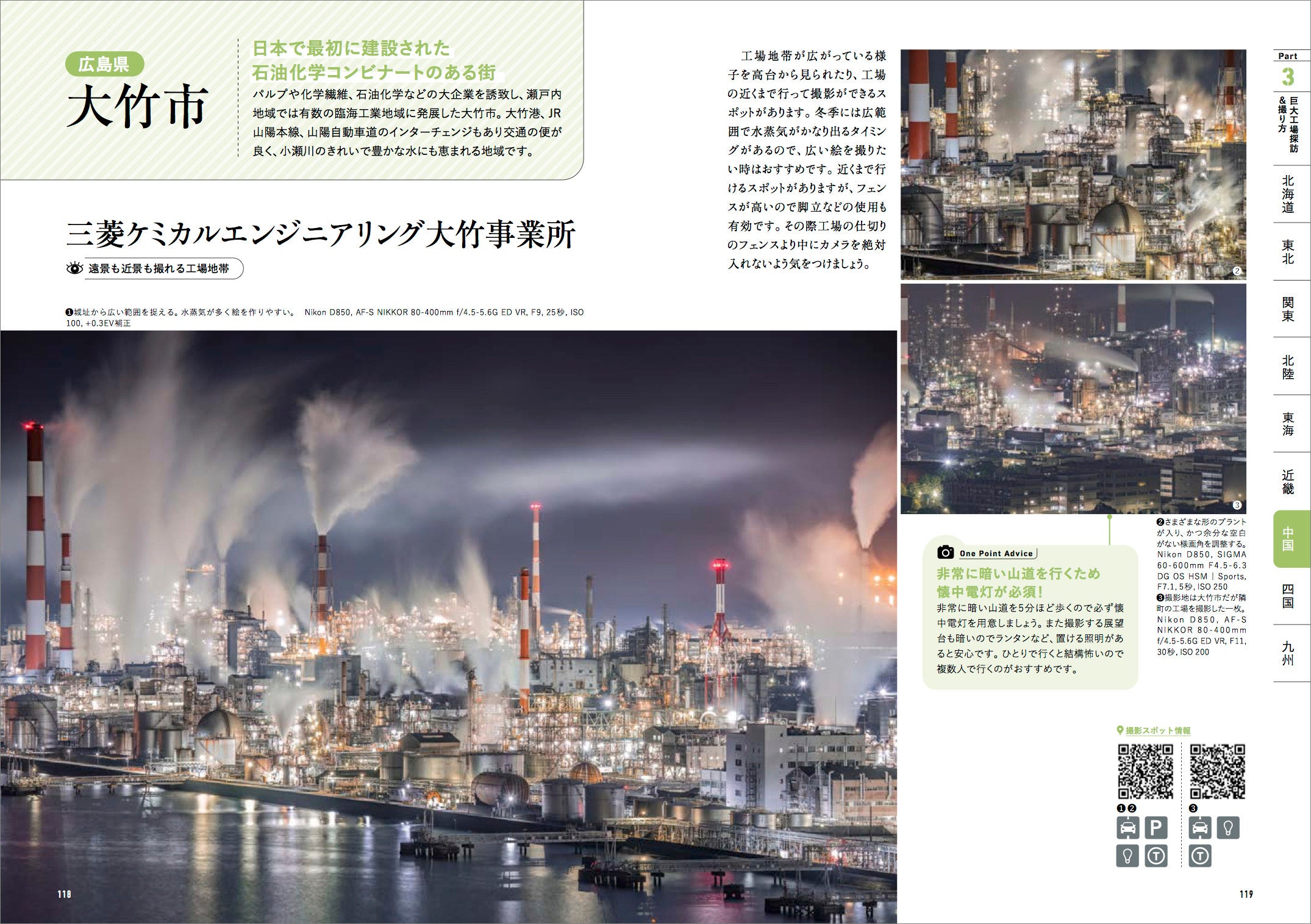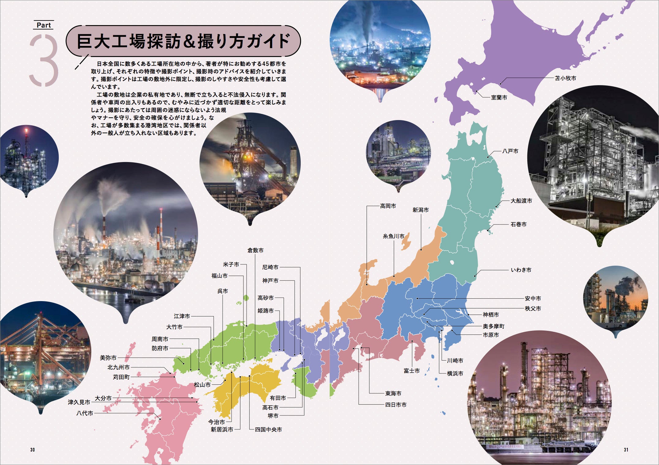 紹介する撮影ポイントは一般人が容易にアクセス可能な場所に限定し、掲載写真も全て工場敷地外から撮影したもの。工場ウォッチャー&撮影者の増加が事故やトラブルにつながらないよう、安全の確保やマナー向上の啓蒙にも務め、私有地にあたる工場の敷地に無断で立ち入らないのはもちろん、関係者や車両の出入りの邪魔になったり周囲の迷惑にならないよう、法規を守った節度ある行動を呼びかけています。また夜間は暗い場所からの撮影も多いので、その対策にも言及しています。
