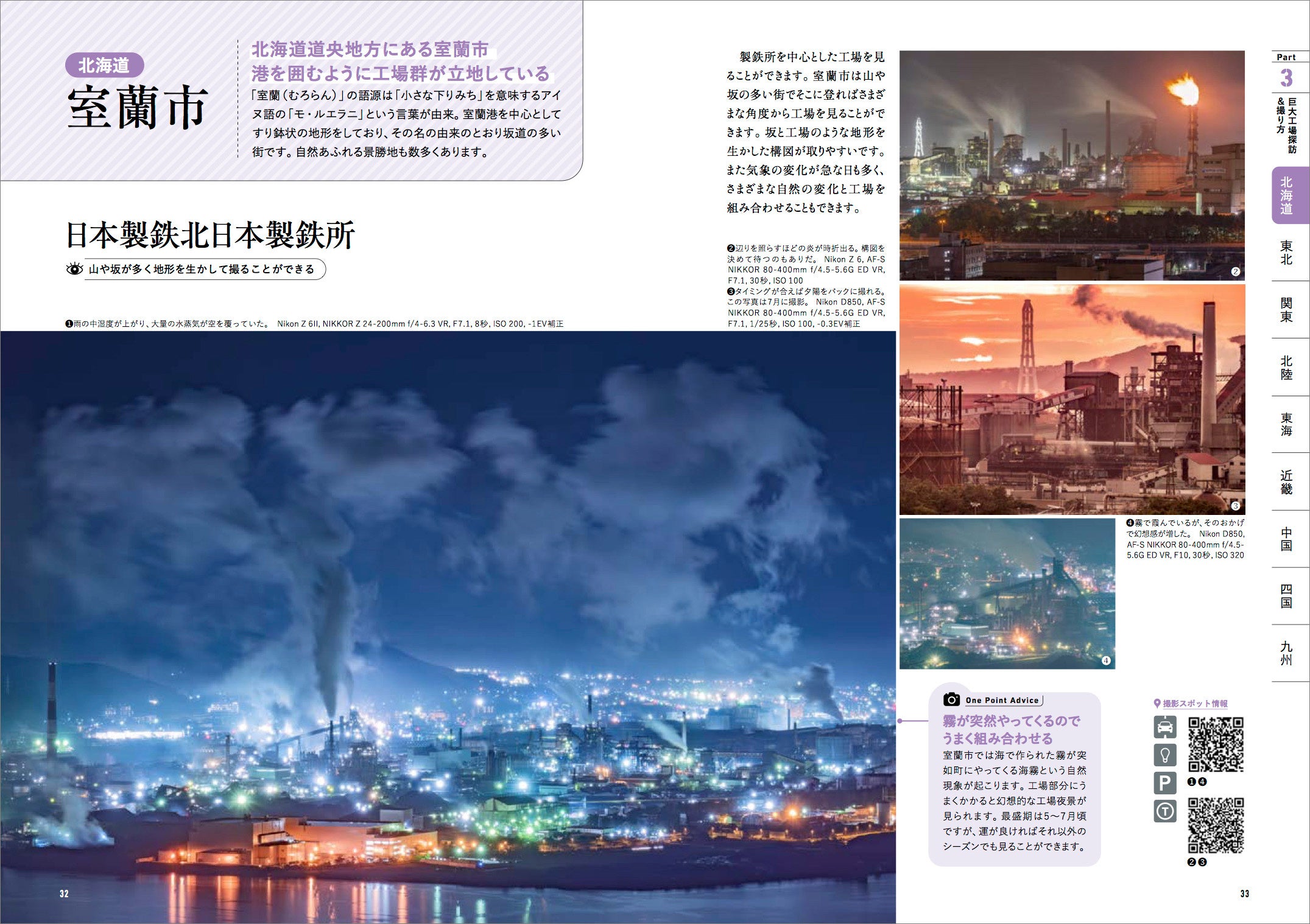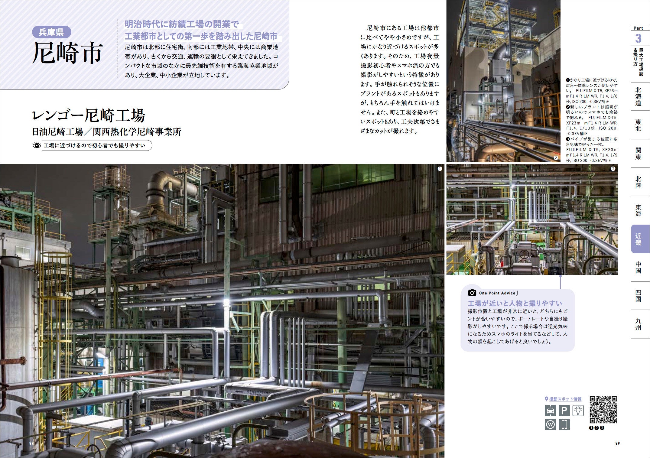 撮影ポイントはQRコードで紹介。スマホから地図アプリで位置を確認できます。アクセス性や交通量、撮影条件などの現地情報はアイコンで示され、素早く理解できます。ページからあえて地図を外すことで、多くの情報をスッキリ整理して見せています。
