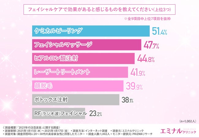 「フェイシャルケアで効果があると感じるものを教えてください(上位3つ)」と質問したところ、『ケミカルピーリング(51.4%)』と回答した方が最も多く、『フェイシャルマッサージ(47.7%)』『ヒアルロン酸注射(44.8%)』『レーザートリートメント(41.9%)』『顔脱毛(39.9%)』と続きました。