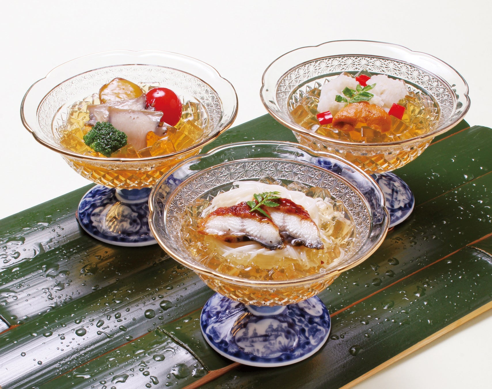 アワビ、ウナギ、ハモ、ウニなどの人気の魚介類に華やかな彩りの食材を組み合わせた煮こごり料理。涼やかな見た目と魚介の旨味を堪能できる夏らしい一品です。