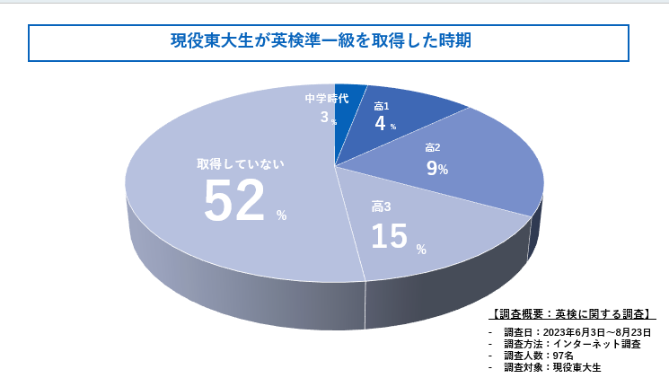 10%の東大生が高1で英検準一級を取得していました。高1段階で受験を意識する人はかなり少なく、この時期に英検準一級を取得できているとかなり受験を上手く攻略できるかと思います。部活と勉強を両立させながら、取っている人も多いようです。