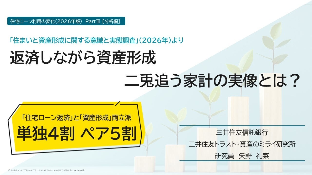 「住まいと資産形成に関する意識と実態調査」(2026年)より 返済しながら資産形成 二兎追う家計の実像とは?を資産のミライ研究所のHPに掲載しています。ぜひ、ご覧ください。