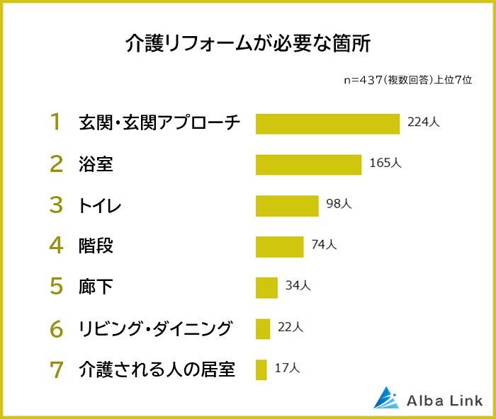株式会社AlbaLink(本社:東京都江東区、代表取締役:河田 憲二)は、30代以上の男女437人を対象に「介護リフォームに関する意識調査」を実施し、そのデータをランキングにしました。