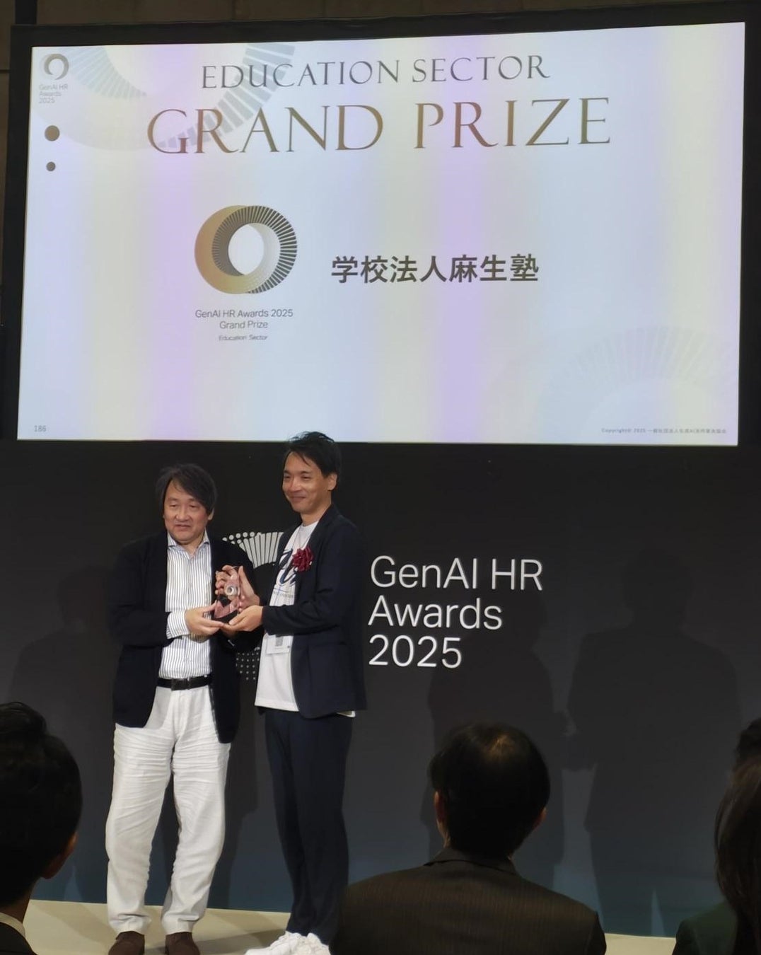 2025年10月9日(木)に開催された、一般社団法人生成AI活用普及協会主催の「GenAI HR Awards 2025」の最終審査・表彰式にて、学校法人麻生塾が教育セクターのグランプリを受賞しました!