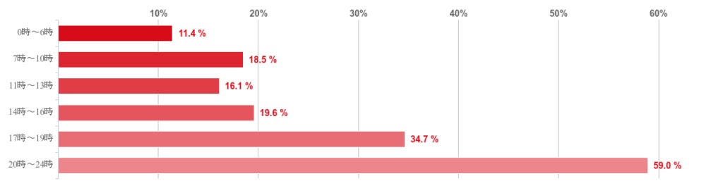 「20時〜24時」が59%で過半数を超え、圧倒的に多かった。なお、その他は「17時〜19時」が34.7%、「14時〜16時」が19.6%であった。