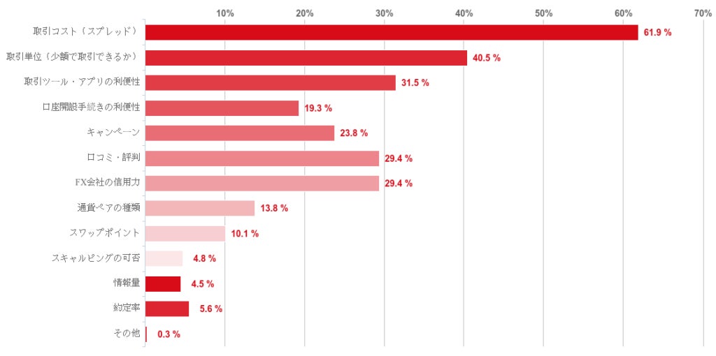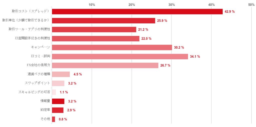 「取引コスト(スプレッド)」が42.9%と4割以上を占め、「口コミ・評判」が34.1%、「キャンペーン」が30.2%でこれに続いた。
