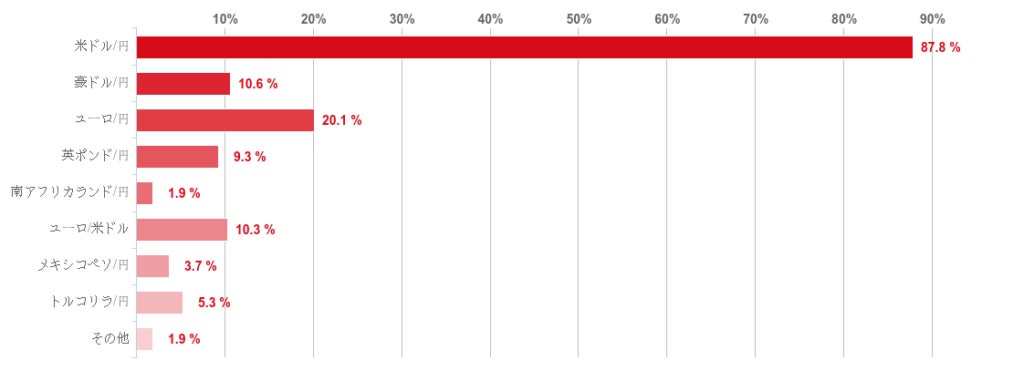 「米ドル/円」が87.8%で圧倒的な人気を集めた。ついで「ユーロ/円」が20.1%、「豪ドル/円」が10.6%となり、上位3つはいずれも円との組み合わせとなった。