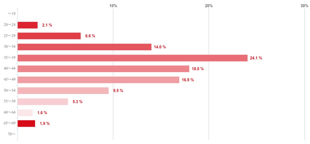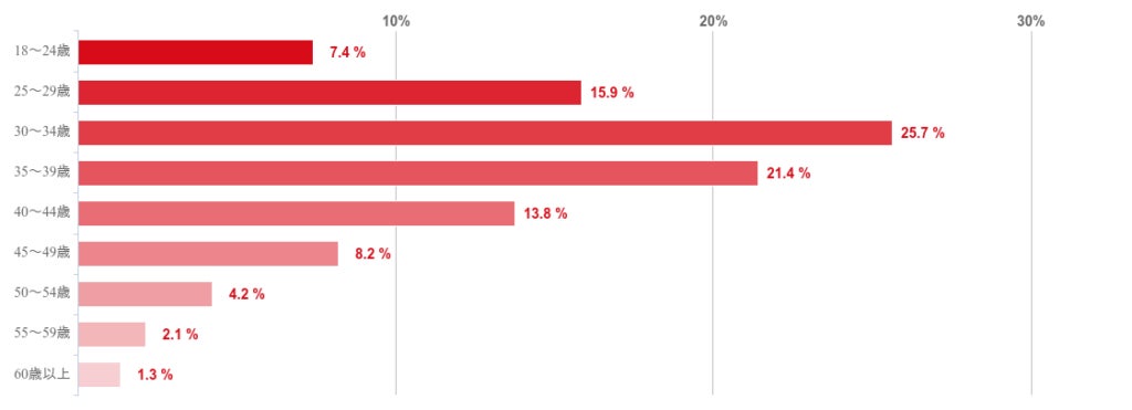 30〜34歳が25.7%で最も多かったが、35〜39歳が21.4%でこれに続いた。なお、全体としては30代までにFXを始める人が70%を超えていた。