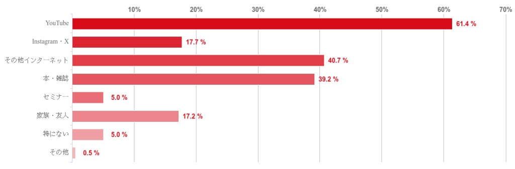 YouTubeが61.4%で最も多かったが、「その他インターネット」(40.7%)、「本・雑誌」(39.2%)でこれに続いた。また、「家族・友人」との回答も17.2%あった。