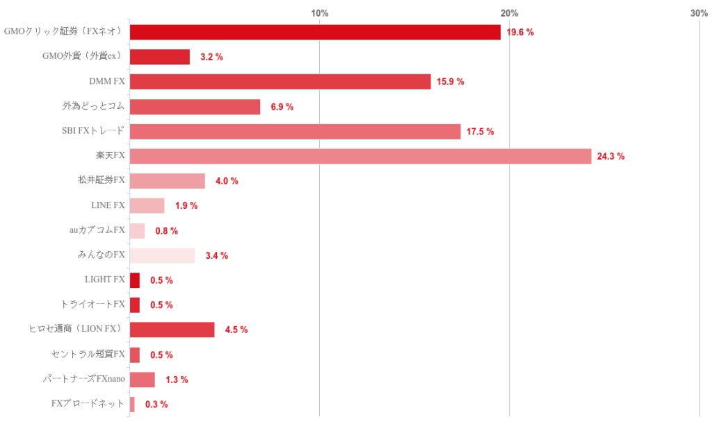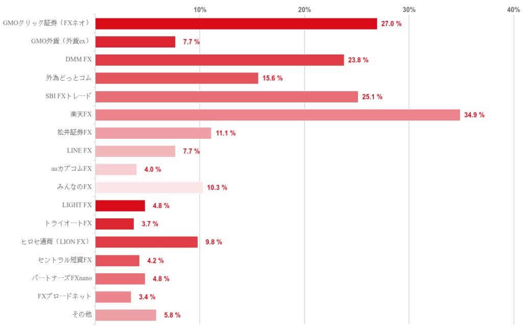 楽天FXが34.9%で最も多く、GMOクリック証券(FXネオ)(27%)でこれに続いた。また、SBI FXトレード(25.1%)、DMM FX(23.8%)なども人気が高かった。