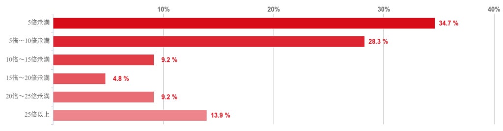 「5倍未満」が34.7%と最も多かったが、「5倍〜10倍未満」との回答も28.3%集まった。一方、「25倍以上」と答えた人も13.9%いた。