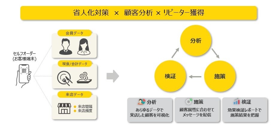 この度、新しくリリースされた「POS+ CRM」は、同社が提供するPOSレジやモバイルオーダーと、LINEヤフー社が提供するミニアプリを活用した顧客関係性マネジメントシステムです。来店時にお客様のスマートフォンでモバイルオーダーのQRコードを読み取ると、対象店舗のLINE公式アカウントに友だち登録され、お客様の来店情報や喫食情報を使ったLINEメッセージ配信が可能です。また、今回新たに提供するCRMダッシュボード上では、それらのデータを活用した分析を可能にし、更に配信したメッセージの効果を検証できるレポート機能も提供します。実施したメッセージ配信がどれだけ来店や売り上げ増加につながったのかを検証することができます。