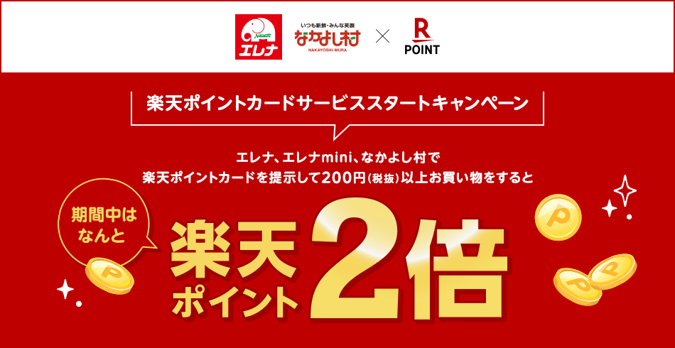 キャンペーン期間中に、「エレナ」「エレナmini」「なかよし村」で楽天ポイントカードまたはアプリを提示して200円(税抜)以上お買い物をされた方に、楽天ポイントを通常の2倍プレゼントいたします。