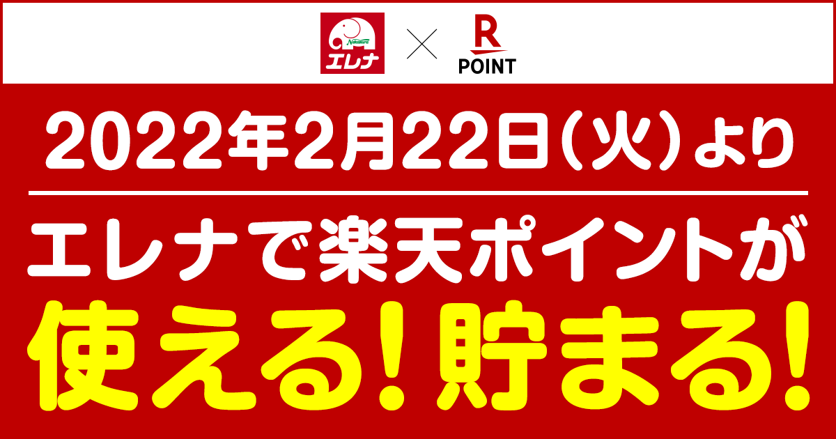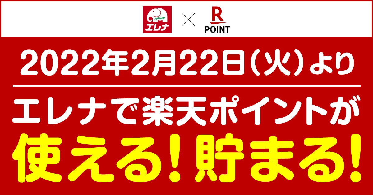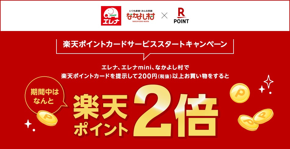 また、本サービス開始を記念して、2月22日(火)から3月14 日(月)まで「エレナ」「エレナmini」「なかよし村」で「楽天ポイントカード」またはアプリを提示して200円(税抜)以上の買い物をされた方に、「楽天ポイント」を通常の2倍プレゼントする「楽天ポイントカードサービス スタートキャンペーン」を実施します。