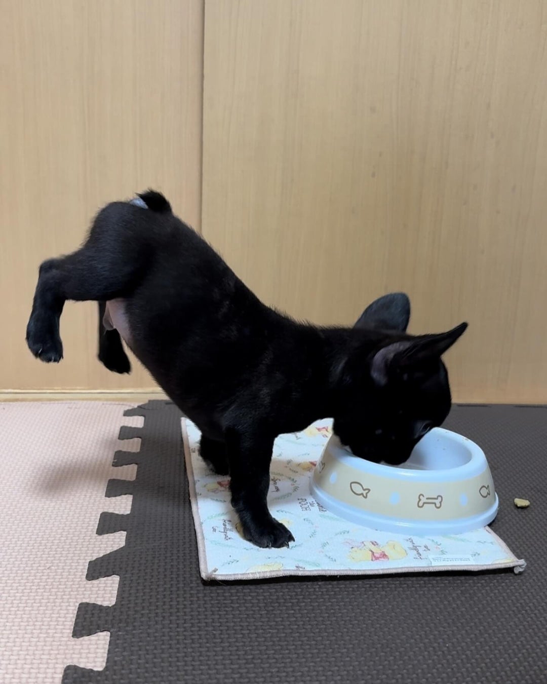 ご飯を一生懸命食べ過ぎてうしろ脚が浮いてしまう姿がとってもキュート♡