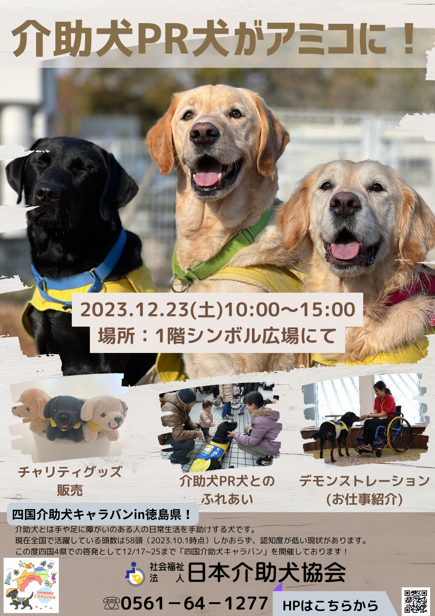 社会福祉法人 日本介助犬協会(本部:神奈川横浜市、理事長;高柳友子、以下協会https://s-dog.jp/)は、12月17日(日)から四国4県の介助犬認知度向上を目的とした「四国介助犬キャラバン」を開催する。徳島県には12月22日(金)、23日(土)の期間滞在し、ゆめタウン徳島(22日)やフジグラン北島(22日)、アミコビル(23日)等の商業施設で一般の方へ向けた介助犬啓発活動、また企業や病院への訪問活動を実施する。訪問先では介助犬PR犬によるデモンストレーション(介助犬のお仕事紹介)やチャリティーグッズの販売、介助犬PR犬とのふれあいも予定をしている。担当者は「徳島県在住の一人でも多くの方に介助犬について身近に感じていただけるイベントにしたい」とコメントしている。