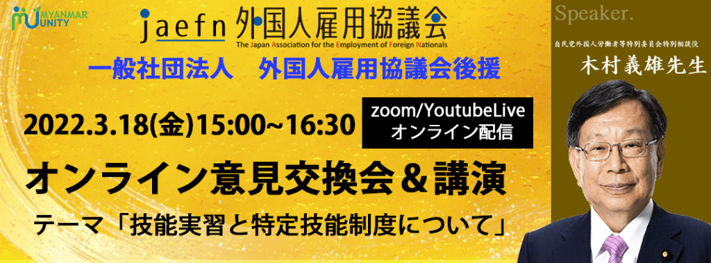 つきましては今回、ミャンマーNo.1人材送り出し機関「ミャンマー・ユニティ」は、「第8回木村義雄先生 技能実習と特定技能制度に関する意見交換会&講演」~後援:一般社団法人 外国人雇用協議会~を3月18日に開催し、参加者の皆様から事前質問をいただき、当日できる限り木村先生にお答えいただこうと考えております。